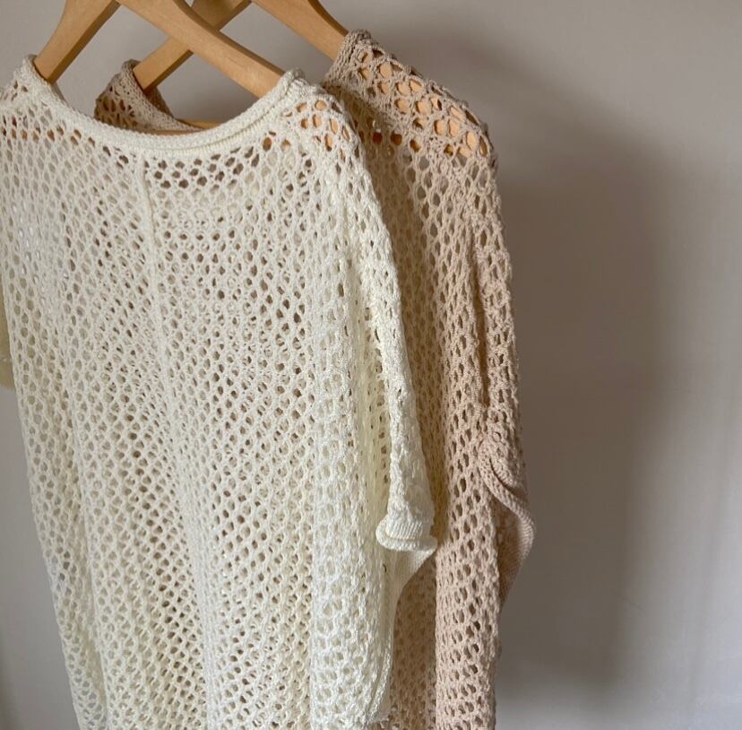 フレンチスリーブのチュニック丈プルオーバーニット。